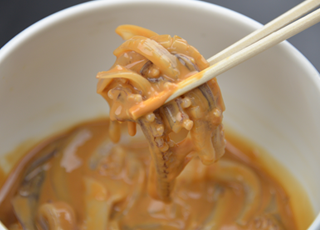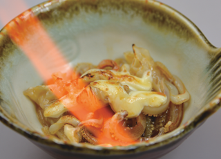 イカ、イカの内臓、キノコを醤油で味付けした一品